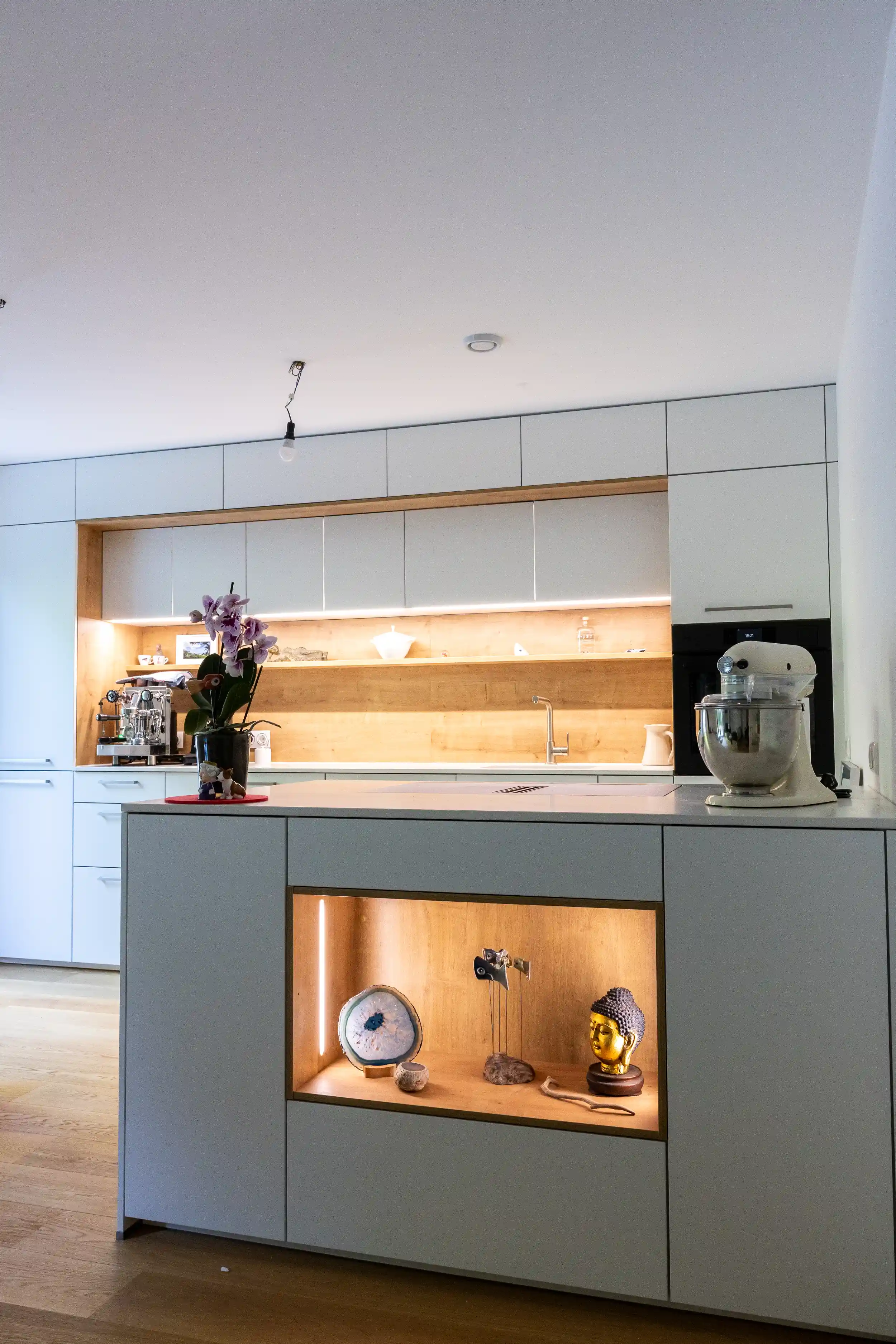 Moderne Küche mit grifflosem Design und aufgesetzten Griffleisten
